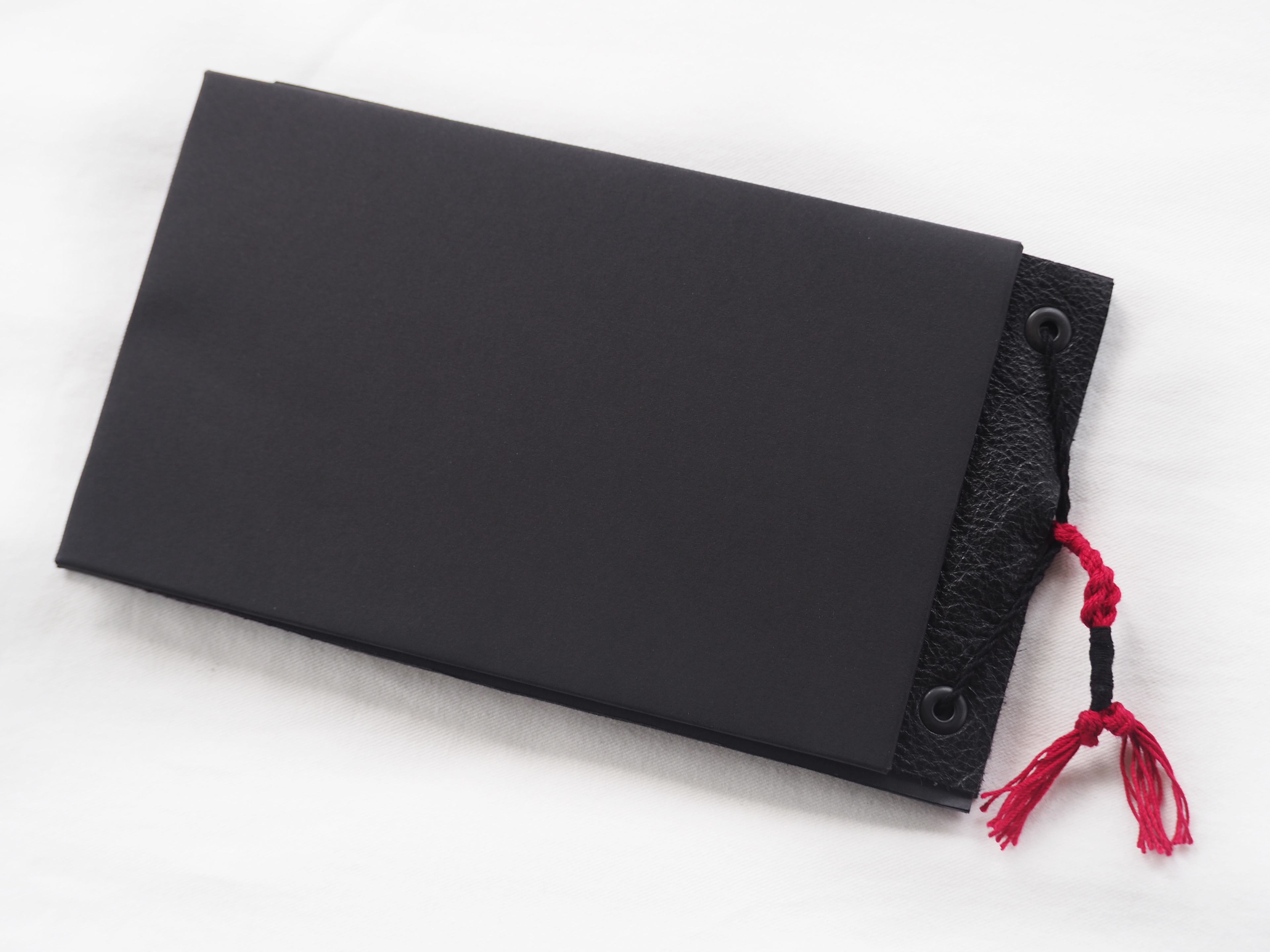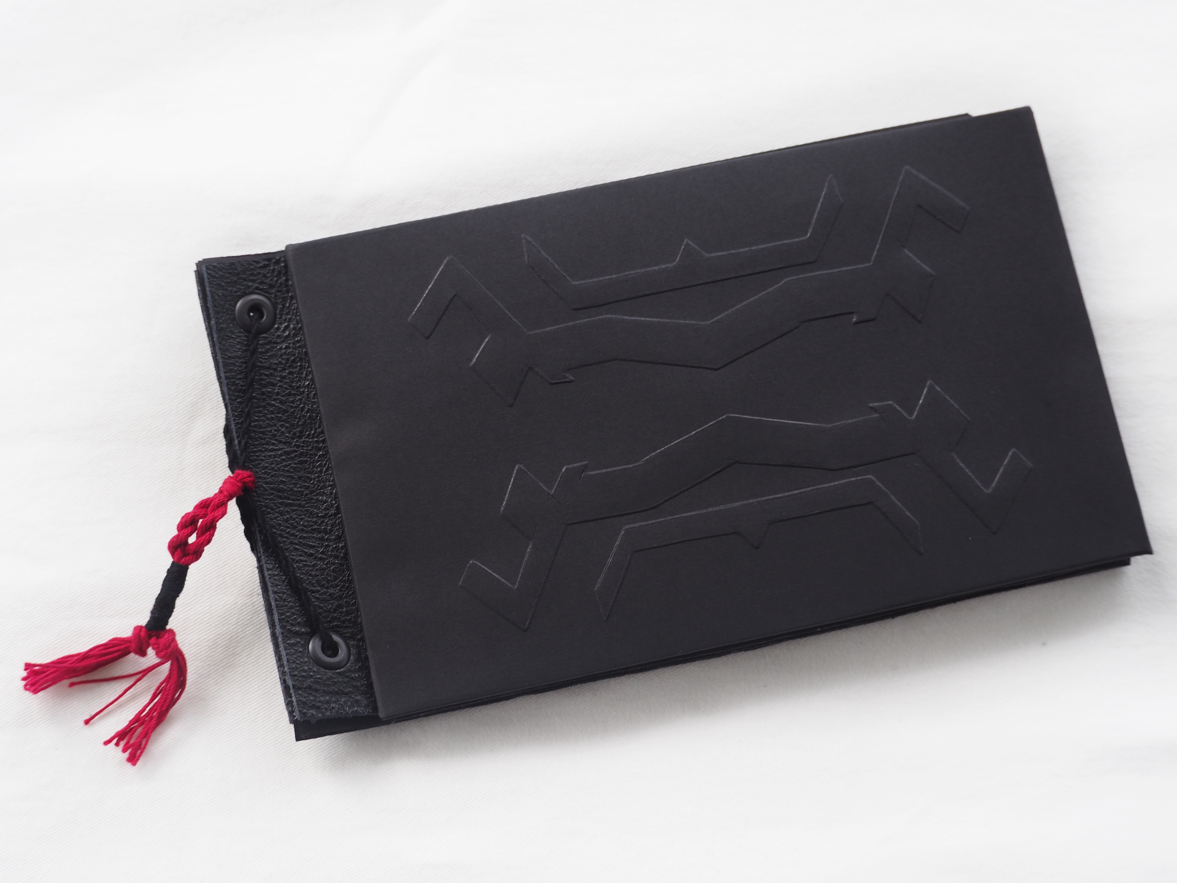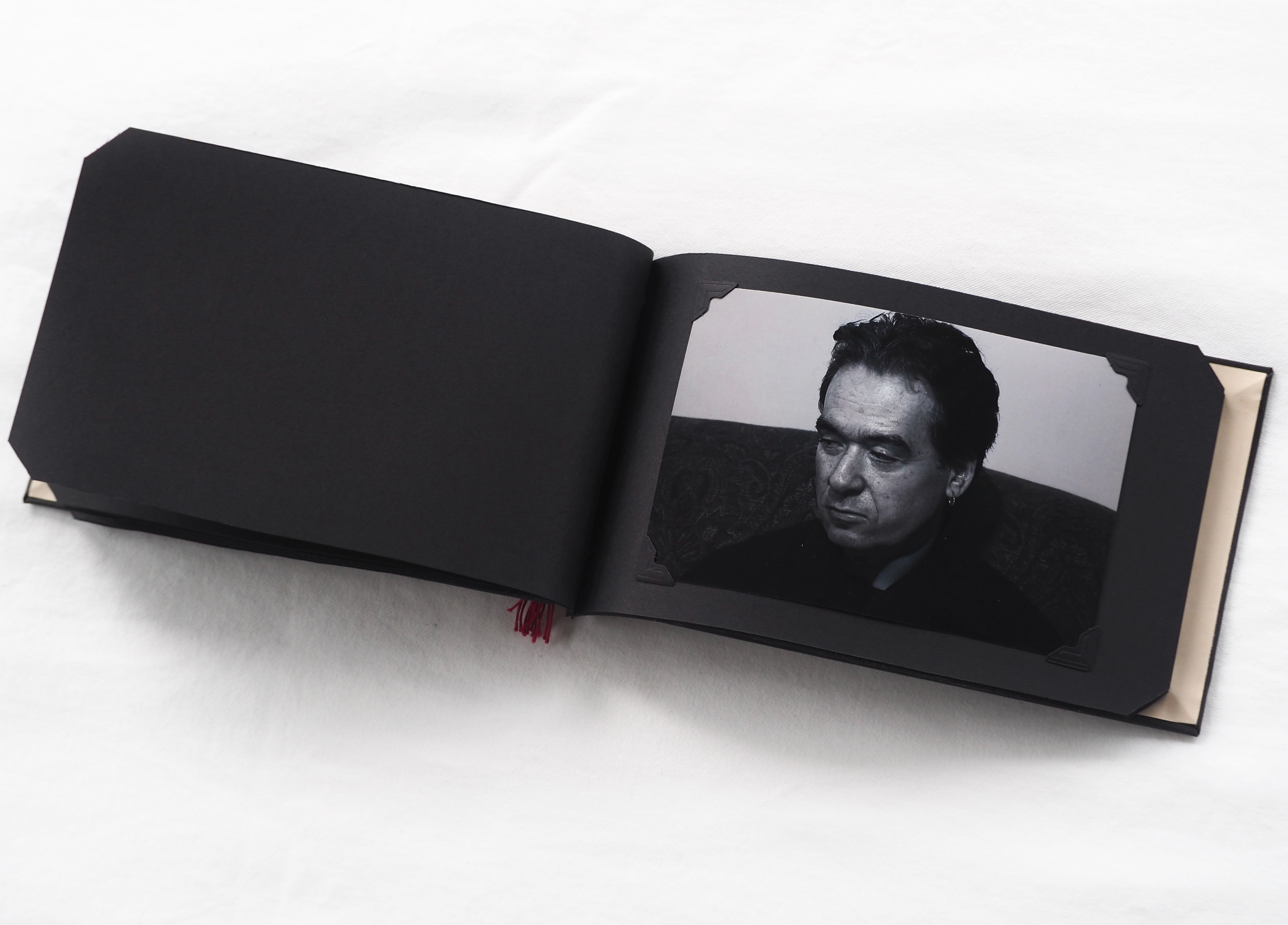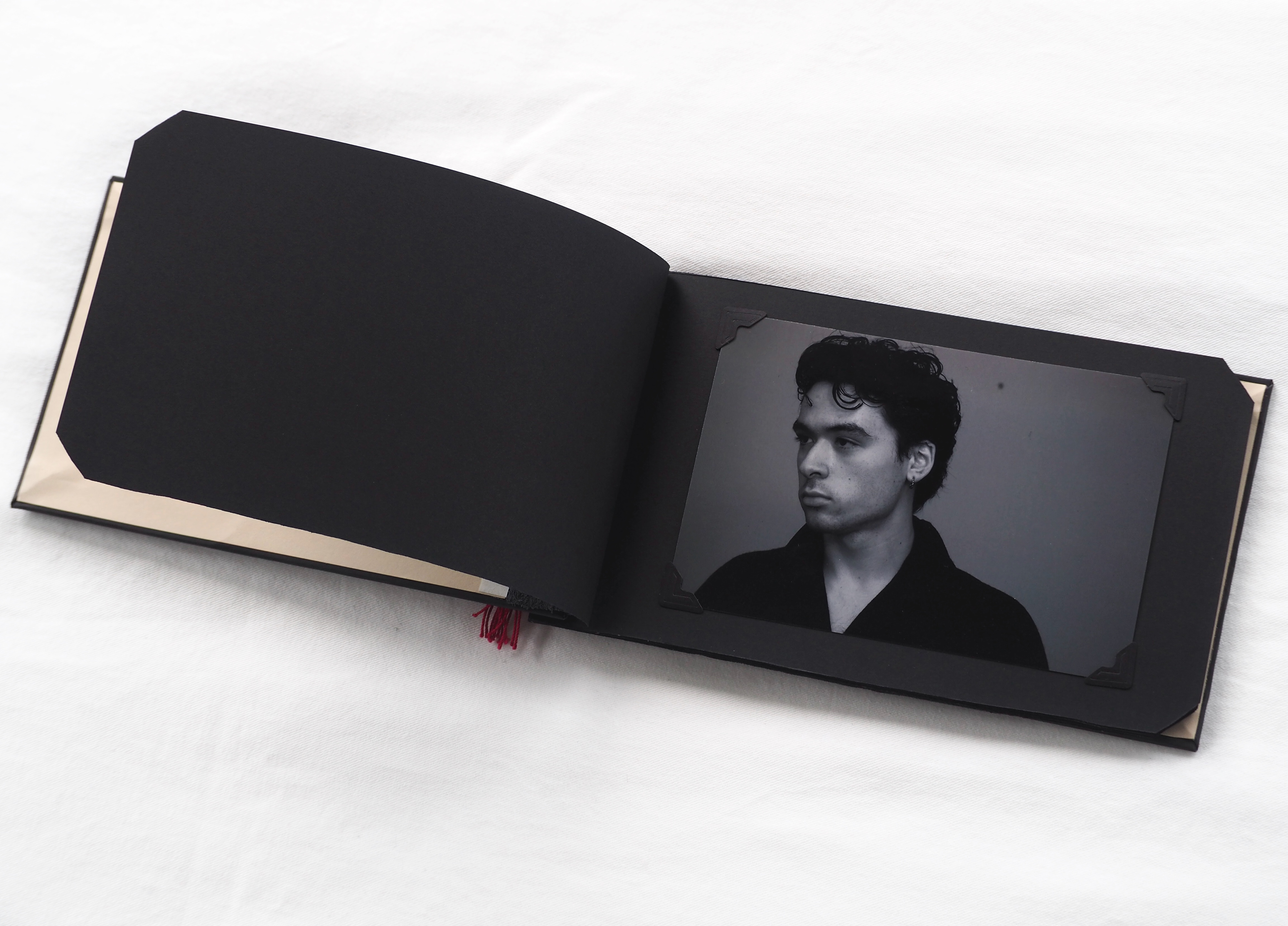 Memoire, 2025 is a direct reflection of my personal interpretation of empathy and how the virtue of compassion is integrated into my life. These themes are displayed through a handmade semi-gloss paper and leather album, which contains black and white portraits of myself gradually aging or declining. The cover of the album is hand embossed with a symmetrical design that is directly inspired by the designs observable on small horizontal 1940’s English Art Deco photo albums. One of the purposes of utilizing an intentionally vintage-inspired design language for the elements of this piece is to convey the idea that this album contains the chronological documentation of a bygone person’s life, which is reduced down to snapshots in black and white.