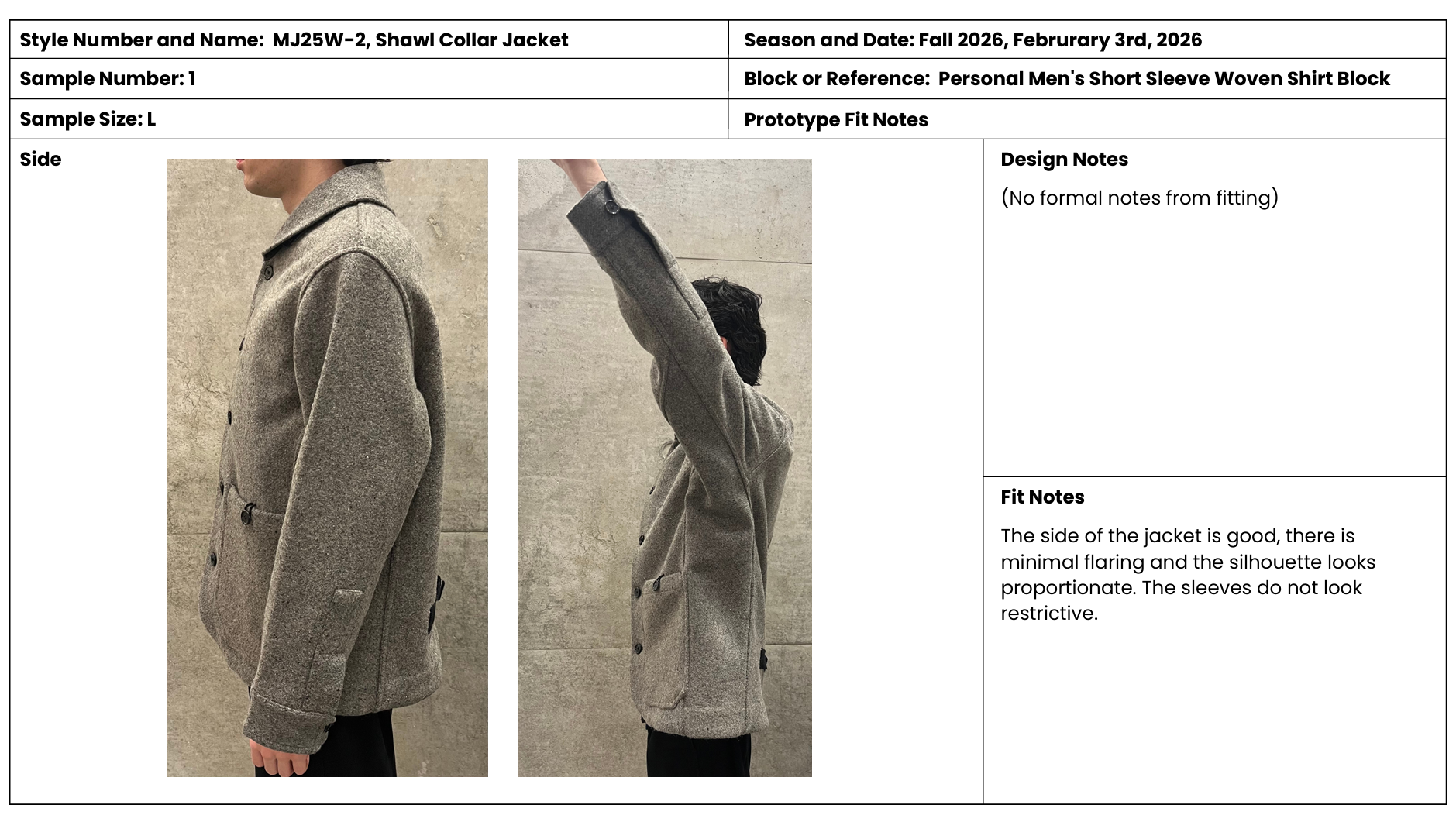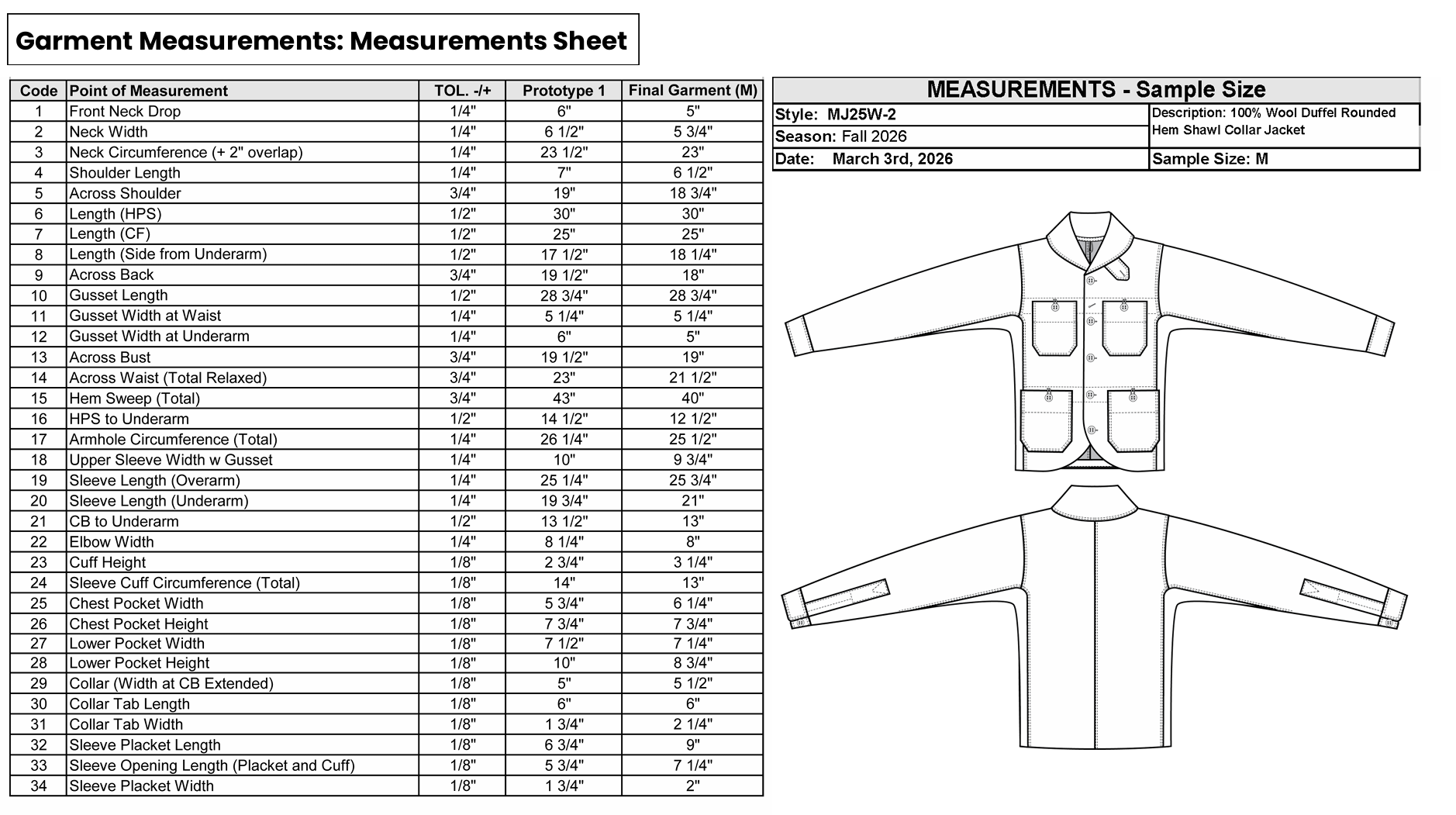 shawl collar jacket spec pack with front and back views, fit and revision notes, style card and measurement and billing sheets.